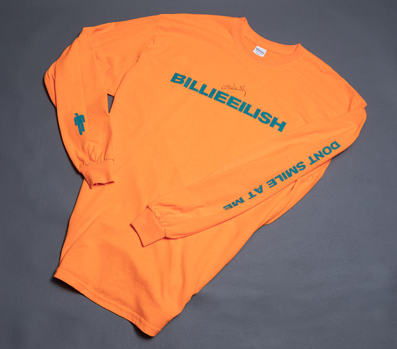 - Billie Eilish “ Don’t Smile At Me”Orange Long Sleeve Shirt. Discontinued Design. Size XL . Signed by Billie Eilish $500.00